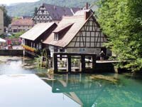 Der Blautopf ist mit 21 Metern eine der tiefsten und größten Quellen in Deutschland. Seine Schüttung reicht von 310 bis zu 32 000 Litern Wasser pro Sekunde. 1985 entdeckte der Pforzheimer Höhlenforscher Jochen Hasenmayer bei einem Tauchgang, der ihn 1250 Meter weit führte, eine gigantische Höhle: den "Mörike-Dom". | |